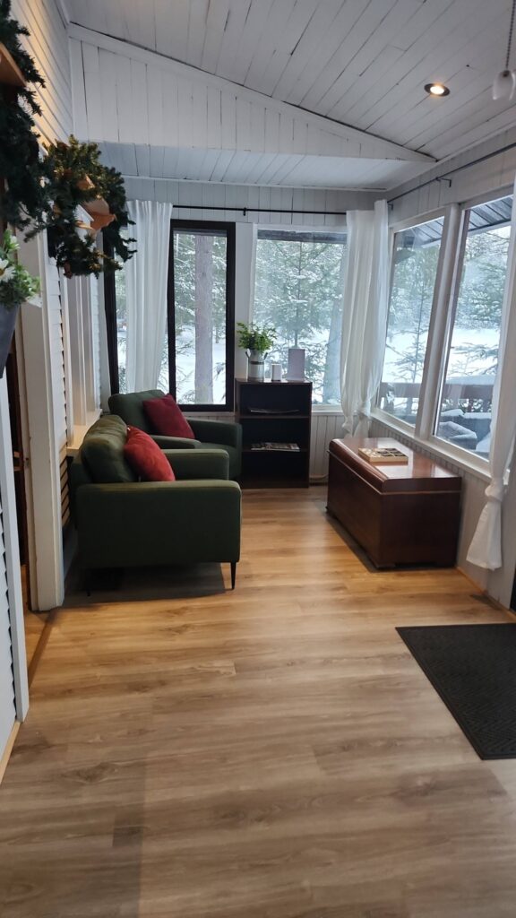 House is very cute and the view (even in winter) is gorgeous! The kitchen had the essentials needed for cooking. The two washrooms are large and well equipped with towels/hand soap/toilet paper. The main bedroom has a gas burning fireplace and very comfortable king size bed. Be aware - there is no door but the room is away from the main living area and up 4 steps. The large couch in the living space can comfortably seat 5 people while watching TV or enjoying the gas burning fireplace. We enjoyed using the sauna (a great way to heat up in -20 cold weather) as well as skating around on the rink area. The third bedroom (double bunk beds) is in the bunkie - not attached to the main cottage and without a bathroom. It was well heated with a cute sitting area. Thank you for allowing us to enjoy your space for a quick New Year's getaway!